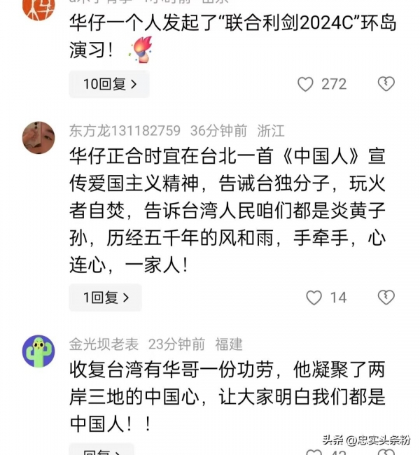 华仔正合时宜在台北一首《中国人》宣传爱国主义精神,告诫台独分子,玩火者自焚,告诉台湾人民咱们都是炎黄子孙,历经五千年的风和雨,手牵手,心连心,一家人!