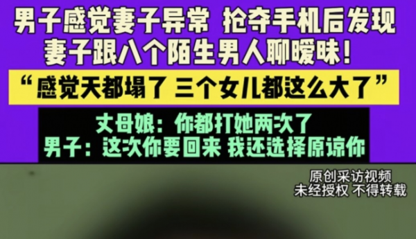 河南开封,男子发现妻子不对劲,把她手机抢过来一看,她跟8个陌生男人聊暧昧,叫别人老公,还偷偷跟男人见面,男子感觉天都塌了!三个女儿都这么大了,妻子竟然给自己戴绿帽,气的他动手打了妻子,没想到,妻子说那就离婚,便离家出走,丈母娘指责男子:你都打了她2次了,男子无奈喊话妻子:为了孩子,你这次回来,我原谅你。男子还说自己也有错?