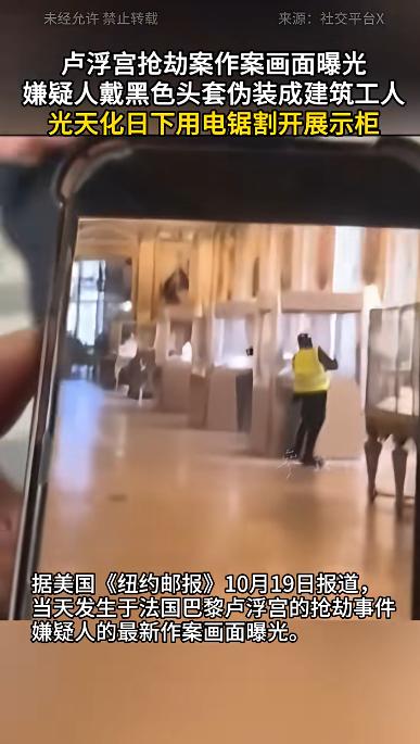 据海客新闻,当地时间19日晚,英国《太阳报》曝光了当天发生于法国巴黎卢浮宫的抢劫事件嫌疑人的最新作案画面。画面显示,嫌疑人戴着黑色头套,身穿偷来的建筑工人服装,手持电锯强行割开展示柜将藏品拿走。