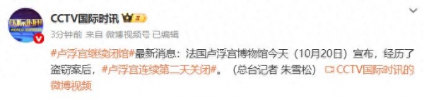 据@CCTV国际时讯,最新消息:法国卢浮宫博物馆今天(10月20日)宣布,经历了盗窃案后,卢浮宫连续第二天关闭。