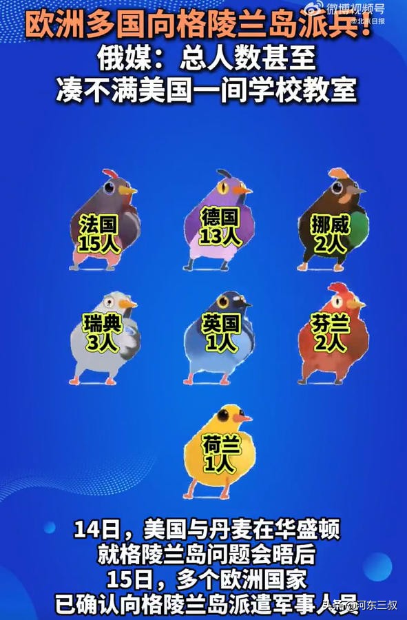 如果论军事实力,丹麦和美国根本不在一个档次,为了让美国知难而退,丹麦前些天还邀请了欧洲各国出兵参加格陵兰岛演习。欧洲盟友表示必须帮忙,大家都很积极出兵援助,不过真的行动起来才发现欧洲这些盟友有多不靠谱。欧洲7个国家派了37名士兵前往声援,法国15人、德国13人、瑞典3人、挪威2人、芬兰2人、英国1人、荷兰1人,再加上丹麦刚好构成"八国联军",但这种兵力不就是开玩笑,难怪俄罗斯媒体嘲讽说还坐不满一间教室。