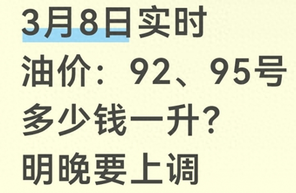 今天是2026年3月8日,对于全国车主来说,有两个消息必须立刻关注:一是当下加油站92号、95号汽油的实时售价,二是明天晚上3月9日24时即将开启的油价调整窗口,这次大概率会迎来年内最大幅度的上涨,市场预测每升最多涨近5毛,加满一箱50升的油,可能要多花25元。