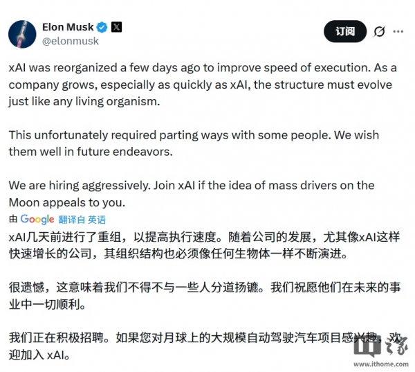 马斯克在 X 平台表示:"当一家公司快速发展时,尤其是像 xAI 这样快速发展的公司,组织架构必须随之升级。遗憾的是,这需要我们与部分员工分道扬镳。我们祝愿他们未来一切顺利。我们正在积极招聘。如果您对月球上的大规模自动驾驶汽车项目感兴趣,欢迎加入 xAI。"