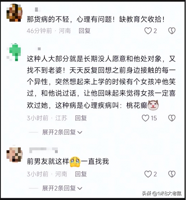 这些网友认为,春天是精神类疾病"桃花癫"的高发季,人一旦得了这种病就会产生别人爱自己的想法,即使被拒绝也认为是考验,继而出现纠缠行为。