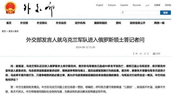 中方对俄乌问题的立场一直是劝和促谈的。对于此次乌军进入俄领土,中方在保持沉默7天后,终于表态。8月12日,外交部例行记者会上,发言人表示:中方注意到了有关情况,中方在乌克兰问题上的立场是一贯的、明确的,呼吁各方遵守军事降温'三原则',即战场不外溢、战事不升级、各方不拱火。中方将继续同国际社会保持沟通,为推动危机政治解决发挥建设性作用。