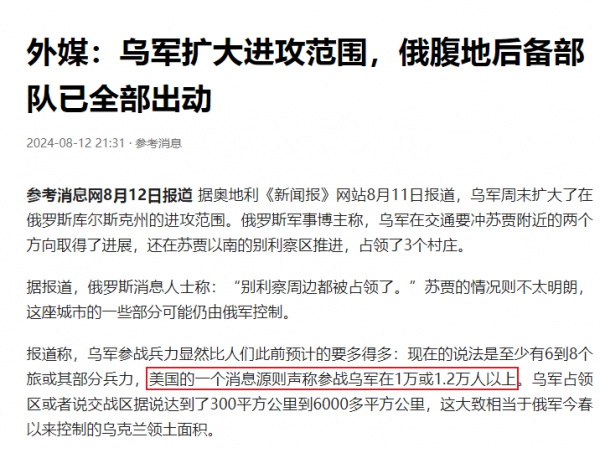 从8月6日开始,这场攻入俄本土的军事行动,乌军出动了5个旅的军队,但据美媒透露,此次乌军不过是有一万人参与了对俄库尔斯克的军事行动,包含有600多辆各种装甲车等,而这个数字是比较靠谱的。毕竟如果乌军真的能出动5万老兵攻入俄本土,那么乌克兰也不至于在乌东屡败屡战,也不至于要征召女囚上战场,一句话,乌克兰兵源不足,因此分析认为美媒披露的一万多人符合现实。