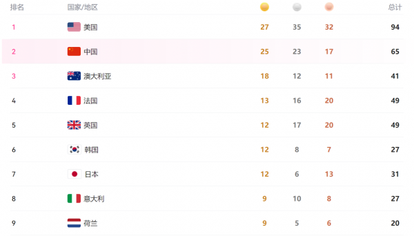 但比赛的激烈程度远不止这些。美国队作为传统的体育强国,这次也没闲着,紧追不舍。到目前为止,美国队以27金35银32铜的成绩领跑整个奖牌榜。看到这里,你可能会问,咱中国队还有没有机会冲击第一?答案是有的!比赛还没结束,中国队在跳水、乒乓球、举重等优势项目上还有很多金牌可以期待。