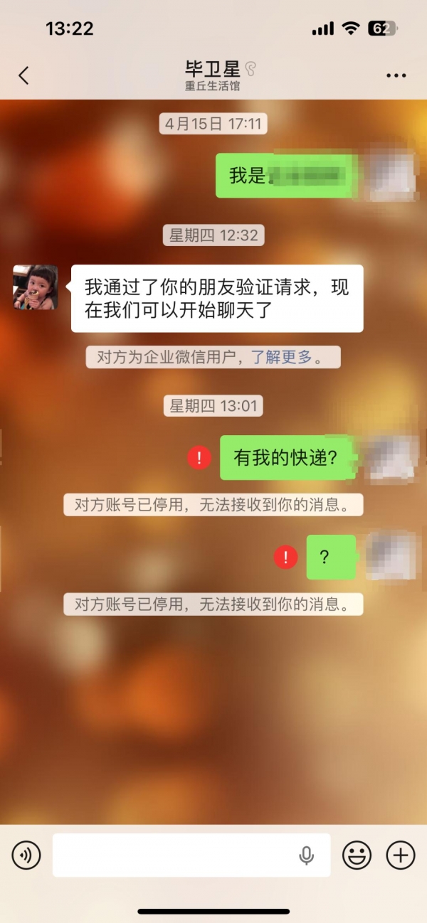 添加之后,赵女士问起快递的事,没想到信息没发送成功,还多了一个红色的问号,底下的一行小字提醒,"对方账号已停用,无法接收到你的信息。"