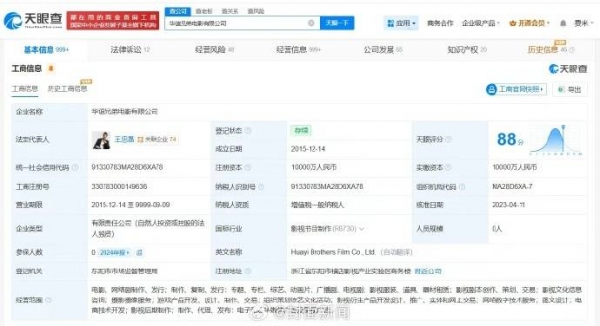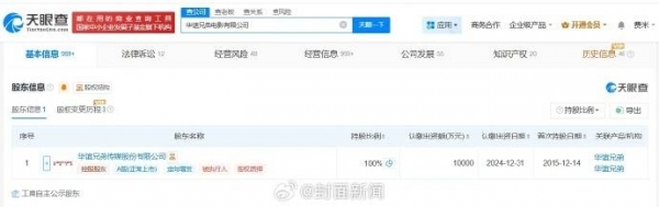 华谊兄弟电影有限公司成立于2015年12月,注册资本1亿人民币,经营范围包括图文设计、电商技术开发、影视后期制作等。股东信息显示,该公司由华谊兄弟(300027)全资持股。