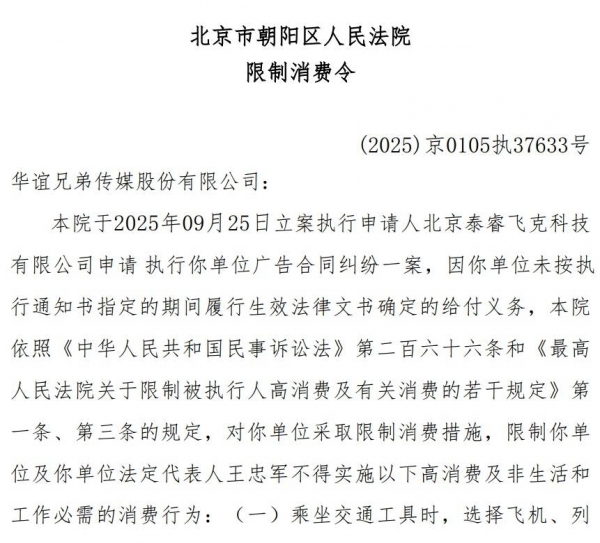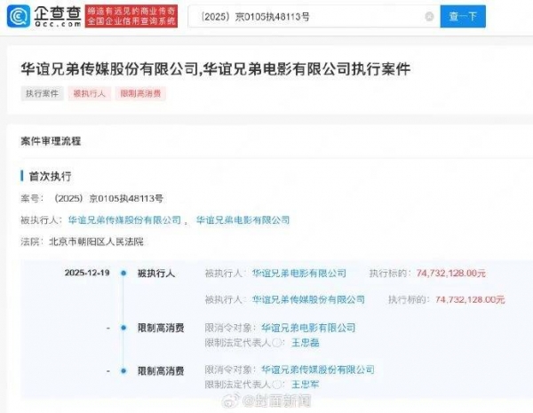 2025年12月29日,华谊兄弟电影有限公司、华谊兄弟传媒股份有限公司及两公司法定代表人王忠磊、王忠军被限制高消费,涉及7473万元执行案件,执行法院为北京市朝阳区人民法院。