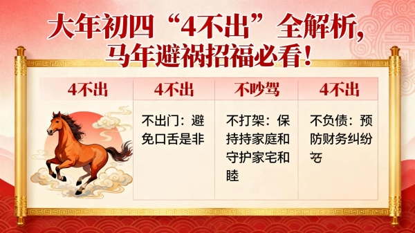 "初四4不出",看似禁忌,实则是老祖宗智慧的结晶。它提醒我们:出门带礼物,守家迎神,保持和气,心态端正,才能招来好运,避开祸患。马年刚刚启程,做好这些细节,既是对传统的尊重,也是给自己和家人最好的祝福。