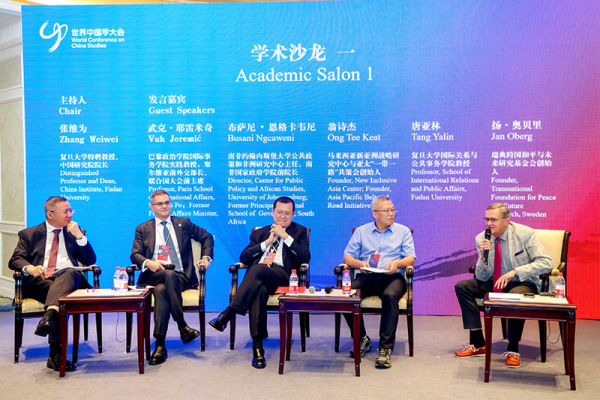 复旦大学中国研究院院长张维为在第二届世界中国学大会分论坛"从世界看中国:文明的赓续与创新"现场主持学术沙龙活动,图为瑞典学者奥贝里发言。 观察者网