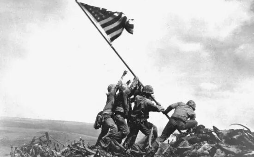 1945年2月23日,美军海军陆战队5师第28团刚刚攻占了折钵山,并于上午10点20分在山顶举行了升旗仪式