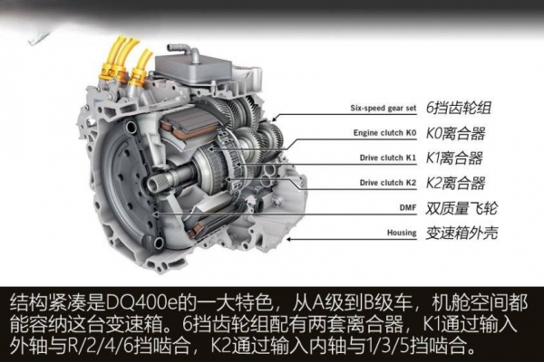 再看大众。主力是P2架构下的DQ400e变速箱,在DQ250六速双离合基础上增加K0离合器。优势是模块化程度高、保留换挡乐趣、动力强劲。但局限性明显:电机位于变速箱输入轴前,能量损耗高于单挡串并联架构;本质上是"油改混"思维,而非混动专用平台。