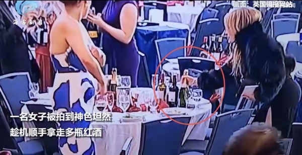 一名女子趁乱疯狂顺走多瓶红酒,多名宾客也揣着酒瓶火速离场,把危机现场当成免费酒局。