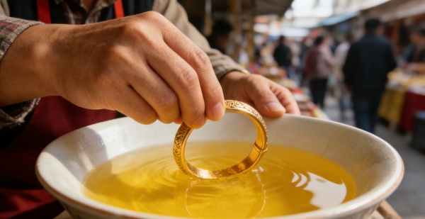 事情的经过并不复杂。去年10月,王奶奶戴着金手镯在集市闲逛时,摊主喻某主动上前搭话,称她的手镯有些变形,不仅能免费敲圆,还能清洗得焕然一新。老人一听"免费"二字便动了心,毫无防备地将手镯递了过去。喻某简单捣鼓几下后,把手镯浸入一个装着黄色液体的瓷碗中,仅仅浸泡二三十秒就捞出擦干交还。