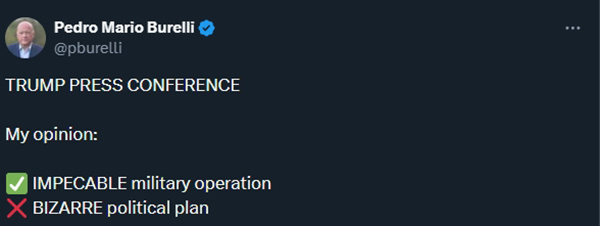 委内瑞拉反对派人士、委国家石油公司前董事佩德罗·布雷利(Pedro Burelli)4日在社媒平台X上直言,军事行动本身或许"无可挑剔",但特朗普提出的后续政治安排"荒谬至极"(bizarre),同时呼吁美国国务卿鲁比奥等人尽快出面澄清这一"不可接受的情况"(unacceptable situation)。