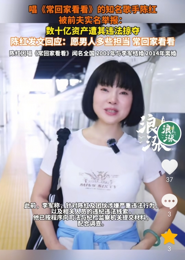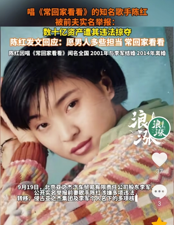 《常回家看看》演唱歌手陈红隐退多年,结果就在近日她的前夫李军,公开指控前妻陈红涉嫌多项违法转移侵占亚之杰集团及李军个人名下多项核心资产,涉案金额高达数十亿元。