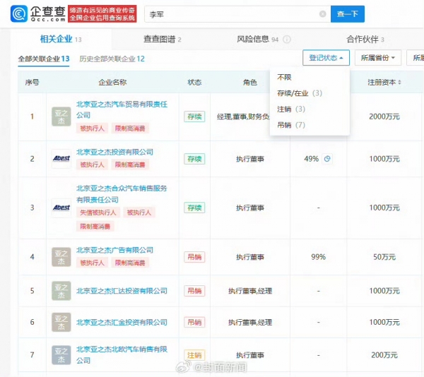 李军介绍,上个世纪90年代初期到2014年,他投资创办北京亚之杰系列公司,产业涉及多个领域。2001年他与陈红登记结婚,2014年3月5日两人正式办理离婚手续。