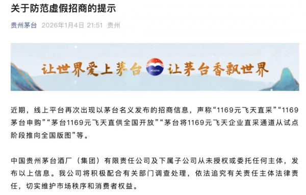 1月4日,贵州茅台通过官方公众号发布《关于防范虚假招商的提示》,明确指出,"1169茅台申购""茅台1169元飞天直供全国开放""茅台将1169元飞天企业直采通道从试点阶段推向全国版图"等消息均为虚假招商。
