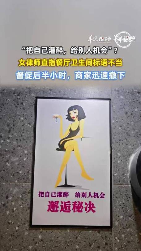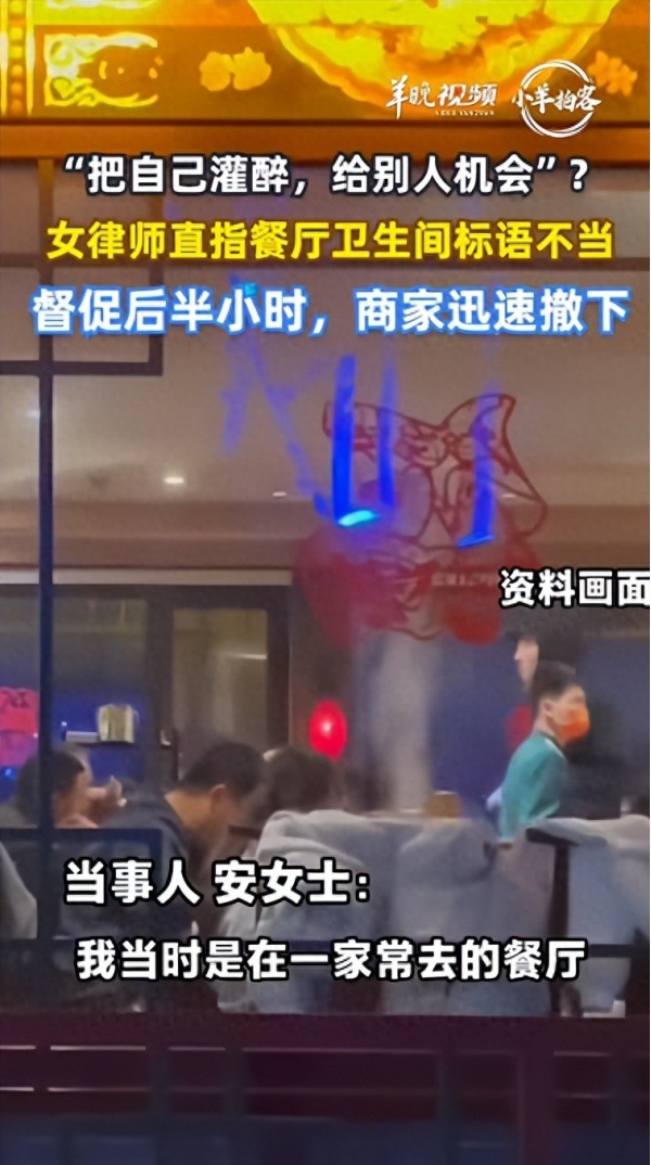 1月25日,河北燕郊安女士在当地一家常去的餐厅女卫生间内,发现一块写有"把自己灌醉,给别人机会"的标语牌。她认为该标语导向不当,随即通过微信向老板直言"思想太恶臭,纵容犯罪",要求撤下。约半小时后,老板不仅撤掉牌子还发来视频反馈。