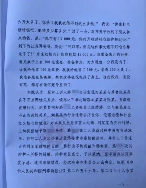 但路某和家人始终没有放弃申诉。他们始终认为,这笔钱是刘某某主动提出的补偿,不是自己强行索要的,根本不构成敲诈勒索。