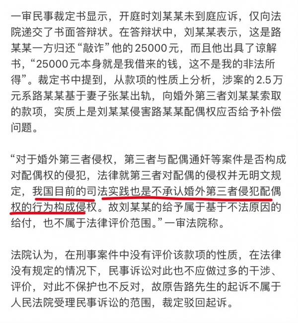 此前因捉奸收取妻子情夫2.5万元补偿、被判6个月有期徒刑,后经再审改判无罪的男子路某,其父亲路先生因追讨当年为拿谅解书退还的2.5万元,以不当得利为由起诉情夫刘某某,被法院一审驳回起诉。路先生与代理律师明确表示,将在近期正式提起上诉。