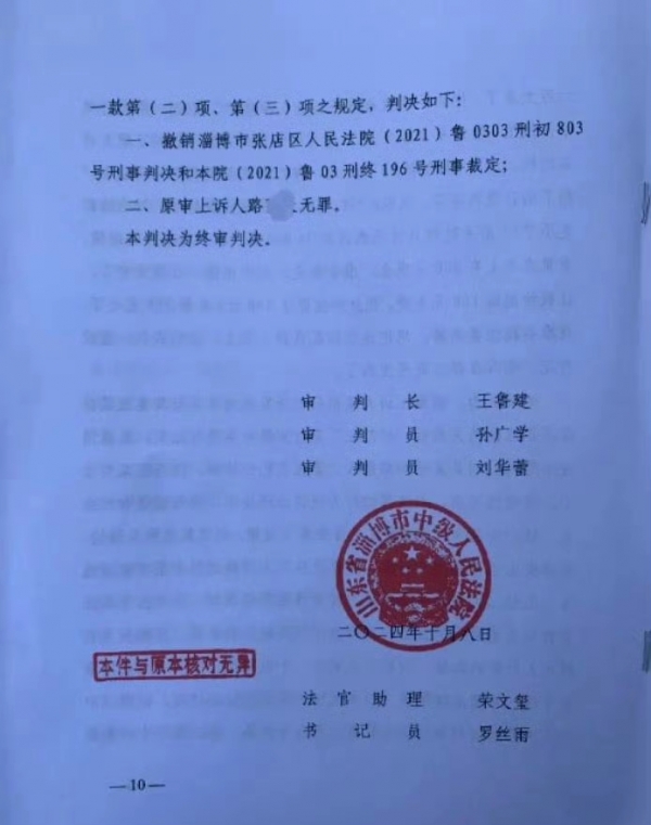 2024年10月8日,淄博市中级人民法院出具再审判决书,彻底推翻了此前的有罪判决,改判路某无罪。
