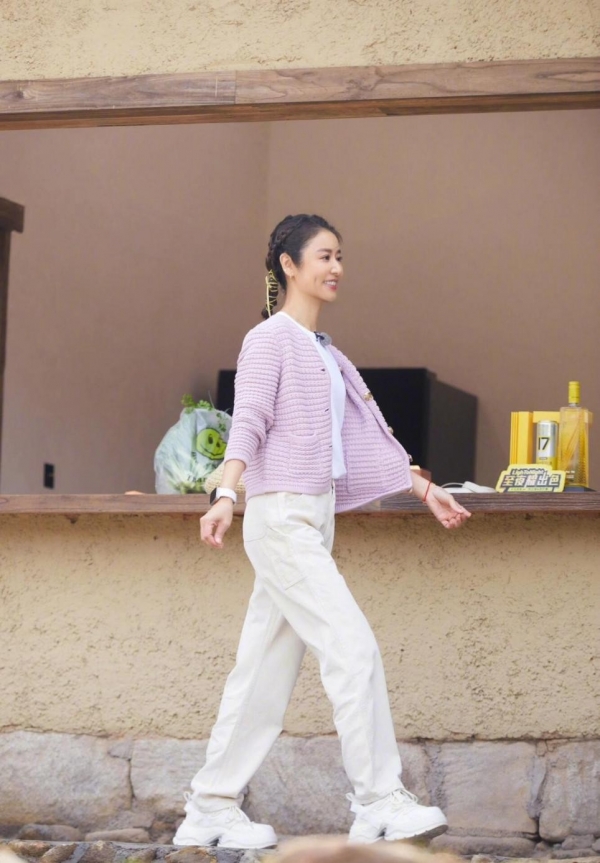 外套是短款设计,上身后就可拉长穿着者腿部线条,让你拥有模特比例。紫色与白色、蓝色都是好搭档,林心如在搭配时选择了白色,上半身内搭、裤子、鞋子皆是。此件白裤子略微宽松,隐藏腿型的同时能有效遮挡肉肉。脚上的白鞋看着有些厚重,不适合夏季。如果你喜欢这身穿搭,当下季节便可购入,让你显年轻的同时美出新高度。