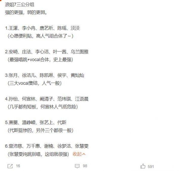从传出的消息上看,第二轮舞台公演的队长是:王濛、安崎、张月、孙怡、萧蔷、曾沛慈,可看到分组名单后,我们只能说:强的太强,弱的太弱。