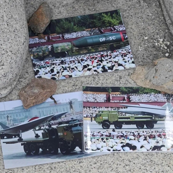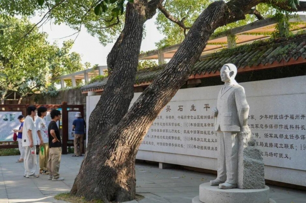 吴石将军雕像前,摆放着三张我国新型武器装备的照片 图源:海峡都市报