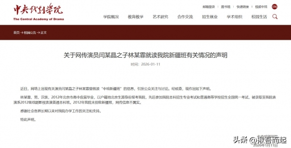 中央戏剧学院发布声明,澄清闫学晶儿子林傲霏当年并非"新疆班"特招,而是合规的北京生源统招。