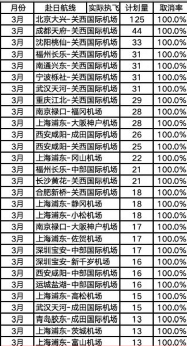 先说说日本航线,情况最严重。根据航班管家数据,2026年3月,53条中国大陆往返日本航线全部取消,取消率高达49.6%,接近一半航线瘫痪。北京大兴-大阪、上海浦东-札幌等热门线路取消率100%。