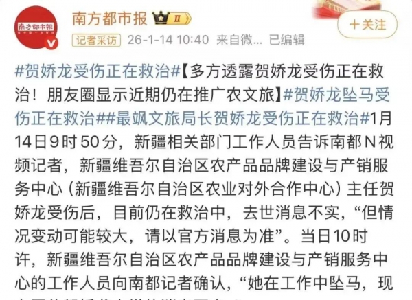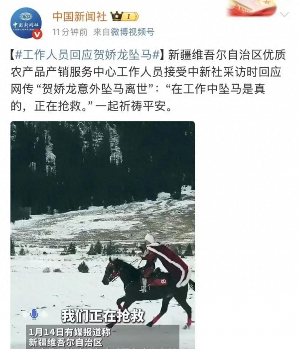 中国新闻社、南方都市报等多家媒体紧急核实,新疆维吾尔自治区优质农产品产销服务中心的工作人员明确回应:"在工作中坠马是真的,正在抢救。""网传贺娇龙去世的消息不实。"