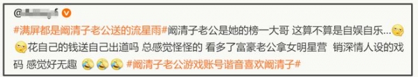 虽然大部分网友都沉浸在阚清子夫妇的甜蜜,但也有网友觉得这压根就是一场自娱自乐,算是花钱送自己出道。毕竟娱乐圈有太多的富豪老公拿女明星营销深情戏码,看多了只觉得无趣。