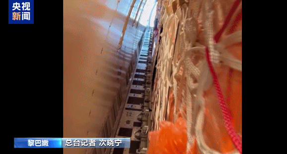 总台记者 次晓宁:我现在就在中国援助黎巴嫩人道主义物资的包机上。整架包机载有约60吨的物资,所有能利用的空间都用来摆放各种物资,装得满满登登。