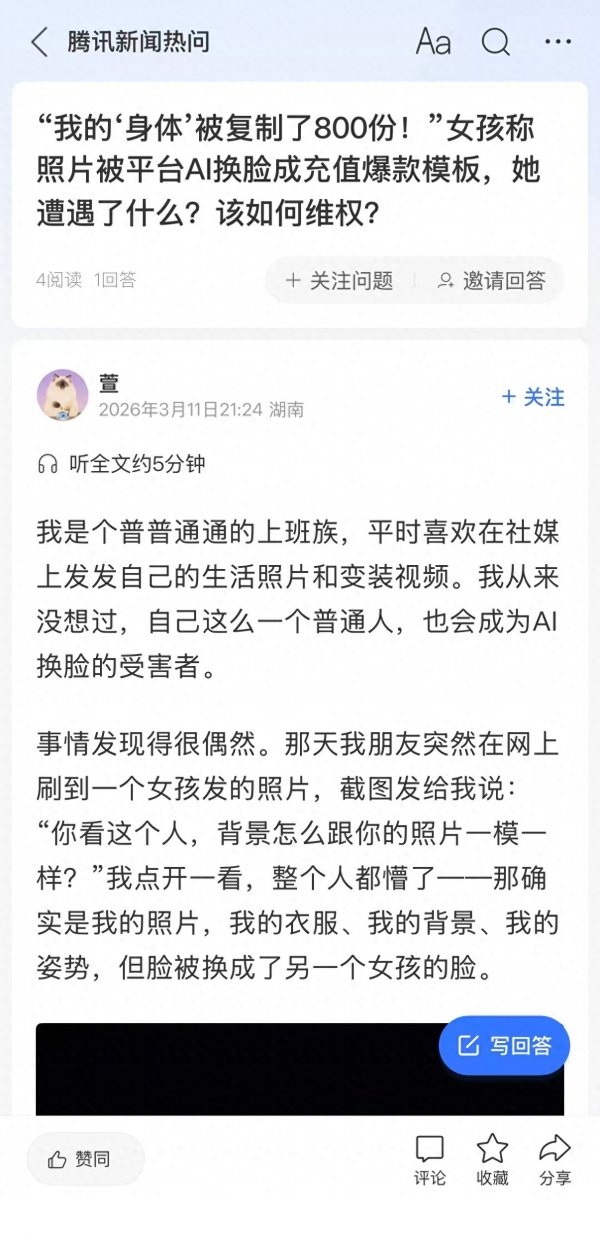小萱去找平台客服,对方并没有回应,在社交平台艾特其官方账号,也是石沉大海。她发现类似情况的受害者不在少数,但大多数人仅停留在吐槽层面。对于维权,小萱感到困惑:"肖像权侵权通常指用我的脸,现在用的是身体,该如何界定?我平时要上班,没时间周旋,而且当前法律对AI换脸的界定仍较为模糊。"
