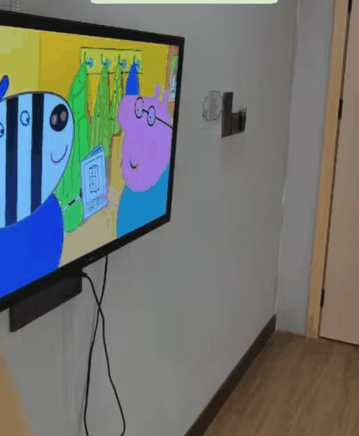 服务员把房卡递给女子后,她和老公带着两个孩子上楼,来到40房间,整理好行李后,累了一天的女子打开电视给孩子看动画片,电视正好播放着《小猪佩奇》。女子躺在床上陪孩子一起看,但看了一会儿,越看越不对劲,电视机旁边挂着一幅窗帘式的画,总感觉怪怪的。