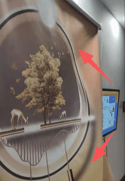 怪在哪里呢?画面从墙顶一直垂落到地上,按理说,这么大一幅画贴在墙面上,加上自身重量,垂落地,应该是平整的,可画面看起来凹凸不平,这也太不符合常理了。