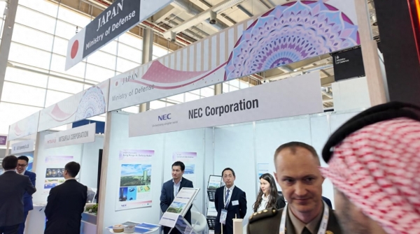 今天,记者在2026沙特世界防务展的一处角落看到日本参展展位。