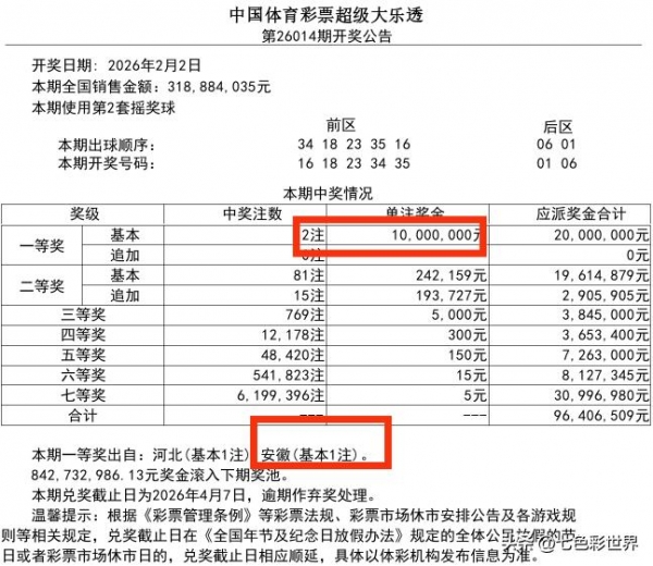 2026年2月2日晚21点25分,体彩大乐透迎来了第26014期的开奖,同时这也是新规实行后的第一期开奖,本期全国销售总额达到3.18亿元,足以说明彩民们对大奖的期待。