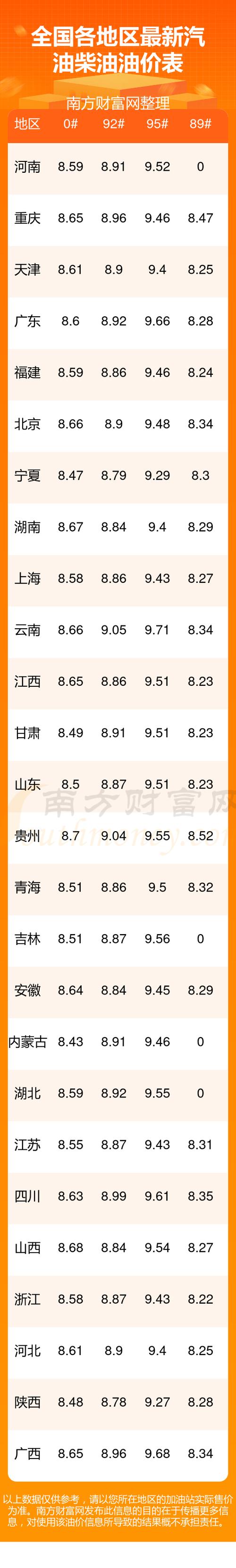 北京、上海、广州等大城市已普遍超过9元/升,而中西部也接近8.9元。