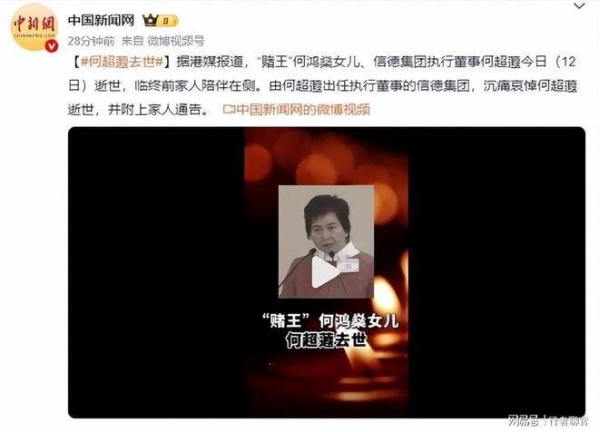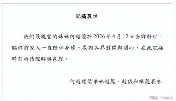 赌王家族再度传来令人心碎的消息:何超蕸安详离世,这位60岁的未婚豪门千金,一生虽低调,却光芒四射。4月12日,香港豪门最不愿面对的消息终于到来--赌王何鸿燊的二房三女、信德集团执行董事何超蕸因病辞世,享年60岁。消息由信德集团官方发布,而何超琼、何超凤、何超仪、何猷龙四姐弟联名致哀:我们最心爱的妹妹何超蕸于2026年4月12日安详辞世,临终前家人一直陪伴在身边。短短数语,却浓缩了二房姐弟深厚的情感,也让这位平日里几乎不抢风头、低调如水的豪门千金,第一次成为舆论的焦点。