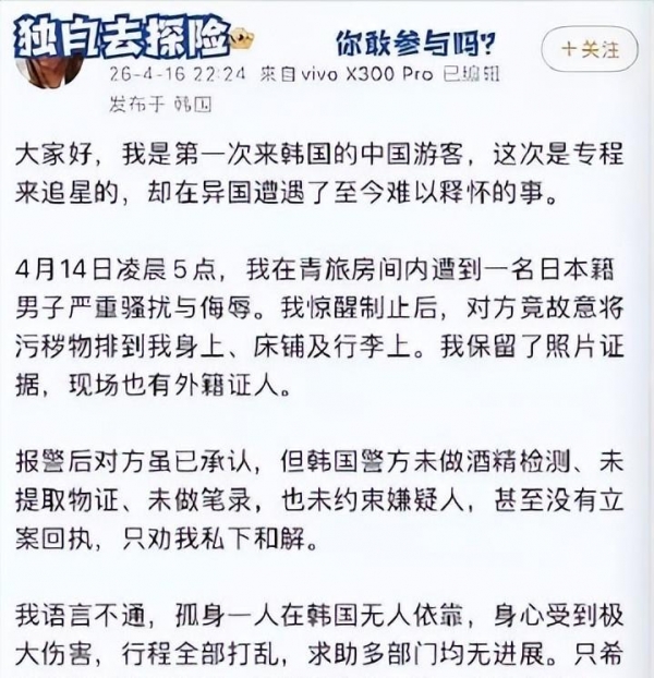 4月15日凌晨,张女士在韩国釜山一家青年旅舍的房间内熟睡。一名日本籍男子趁她睡觉,实施了严重的骚扰与侮辱行为。据张女士描述,对方甚至故意将污秽物排至她的身体、床铺及行李上。这种恶劣程度,已经不是简单的"性骚扰",而是赤裸裸的侮辱和伤害。