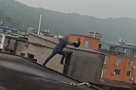 走投无路的白某依然负隅顽抗,以"跳楼"相威胁妄图逃脱,甚至不顾自身危险,从阳台两米空隙跨越跳至隔壁楼顶,现场险象环生。