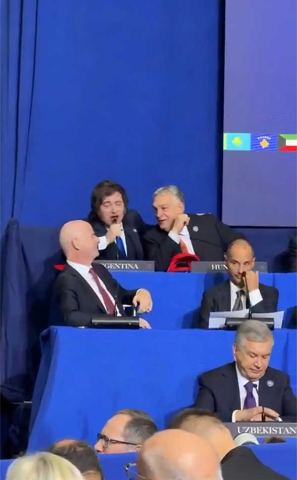 2月20日,欧尔班和阿根廷总统米莱在"和平委员会"成立大会上轻松交谈的一段视频在社交媒体上疯传。视频中,米莱对着面前的麦克风模仿唱歌,背景音乐是猫王的歌曲。他拥抱了奥尔班,两人笑着交谈了几句。这段视频很快被X网站上的几个右翼账号转发,并被比作"在课堂上坐在自己最好的朋友旁边。" X