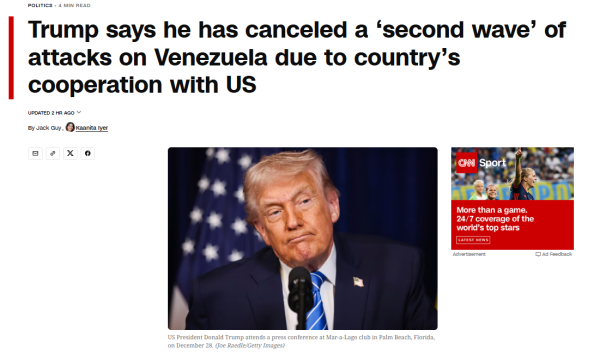 美国当地时间1月9日,特朗普宣布取消对委内瑞拉第二波军事打击。 CNN报道