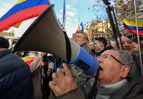 1月4日,民众在西班牙马德里市中心的美国驻西班牙大使馆前,抗议美国对委内瑞拉采取军事行动。新华社