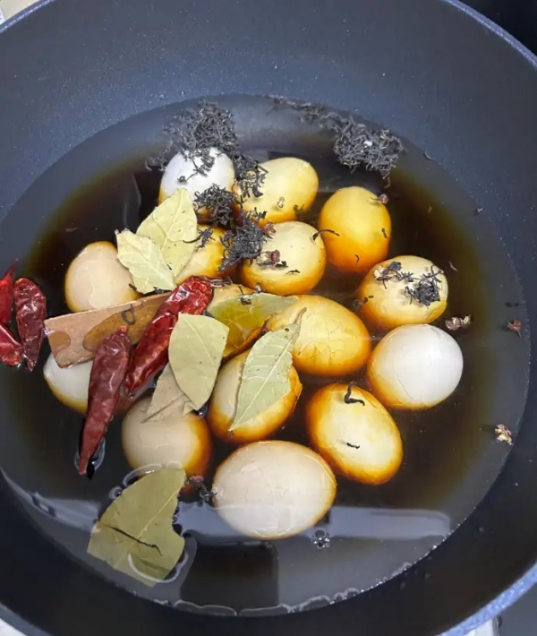 光加盐不够,想让鸡蛋更香,一定要加茶叶。家里普通红茶、绿茶都能用,红茶煮出来颜色深、香味浓,绿茶煮着吃着清爽,别用浓茶和过期茶就行。喜欢重口味,还能加1个八角、小段桂皮,煮的时候满屋子飘香,比外面买的还好吃。