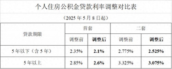 根据2025年5月7日发布的《中国人民银行关于下调个人住房公积金贷款利率的通知》,自2025年5月8日起,下调个人住房公积金贷款利率0.25个百分点,5年以下(含5年)和5年以上首套个人住房公积金贷款利率分别调整为2.1%和2.6%。5年以下(含5年)和5年以上第二套个人住房公积金贷款利率分别调整为2.525%和3.075%。